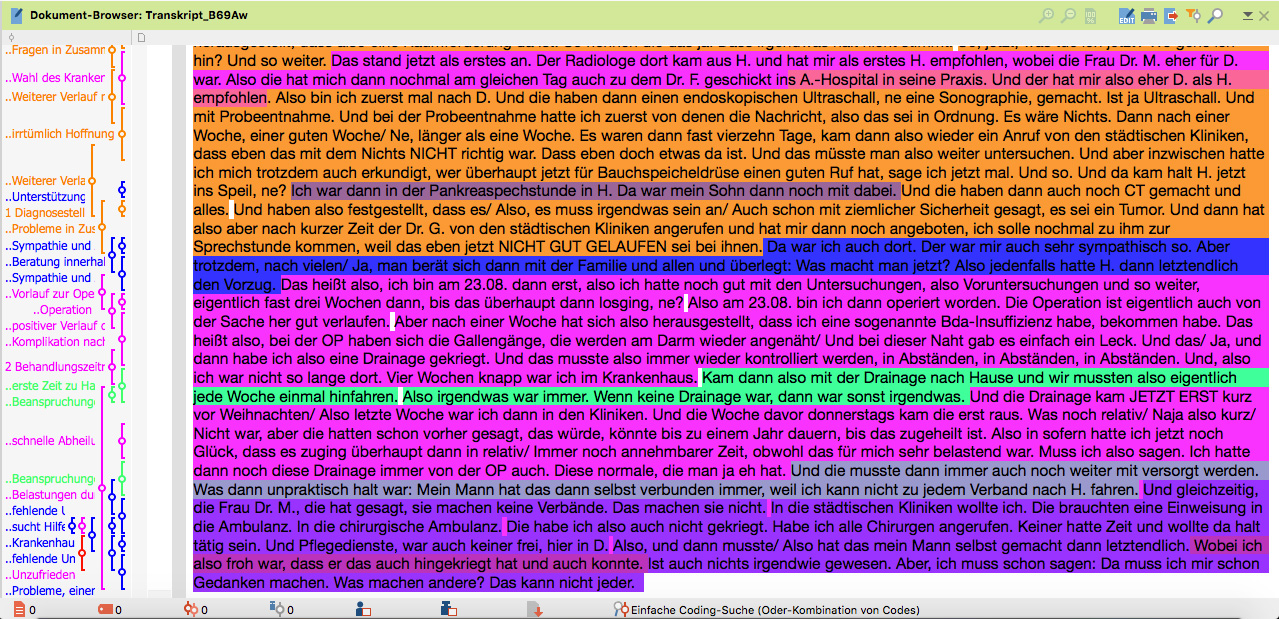 In diesem Beispiel bilden die gefetteten Begriffe die Kodes innerhalb der Kategorie Vorlauf zur Diagnosestellung. Das System zur Kodierung ist hierbei nicht starr oder vorgegeben. Vielmehr entwickelt es sich aus den Texten und ist somit einzigartig.