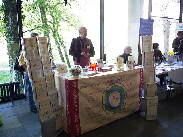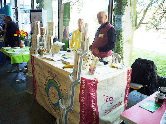 Als eingespieltes Team hatten das Ehepaar Winter und ich unseren Tisch mit unseren Flyern und Info-Broschüren rasch aufgebaut und standen dann dort den Besuchern zur Verfügung. Unser Stand bot den Besuchern einen wunderschönen Blickfang. Wir hatten einen guten Standplatz, denn die Besucher von Vorträgen mussten an unserem Stand vorbeigehen, da wir uns in unmittelbarer Nähe des Hörsaals befanden. Schon bald fanden sich die ersten Betroffenen und Interessierten mit vielen Fragen zu TEB e. V. und der persönlichen Krankengeschichte ein. Unsere Beratung wurde in sehr starkem Umfang wahrgenommen. Wir konnten viele Hinweise zu Diagnostik und Therapie unterbreiten, die dankbar aufgenommen wurden. So waren wir fast den gesamten Tag über beschäftigt, wobei immer mindestens einer von uns am Stand zur Verfügung stand.